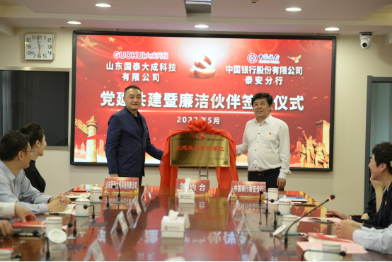 为进一步加强银企合作,提升党建工作质效,近日,中国银行泰安分行与山东国泰大成科技有限公司举行“党建共建及廉洁合作协议”签约仪式,携手联建党建工作新阵地。