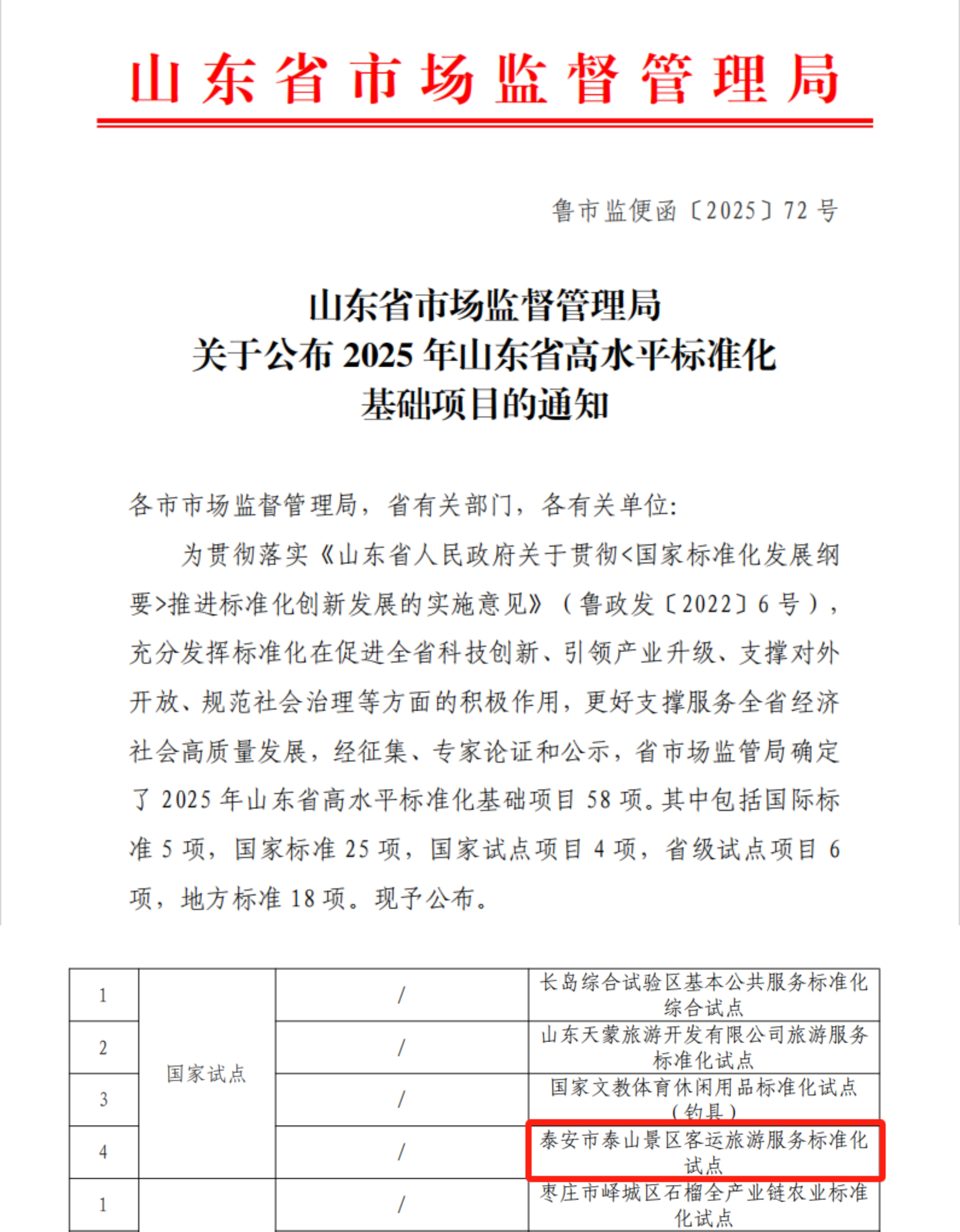 近日,山东省市场监管局发布《关于公布2025年山东省高水平标准化基础项目的通知》,由泰山景区市场监管分局指导推荐、泰安市泰山景区客运有限公司承担的“客运旅游服务标准化试点”成功入选,且为泰安市唯一获此殊荣的试点项目,为泰山文旅标准化建设再添浓墨重彩的一笔。