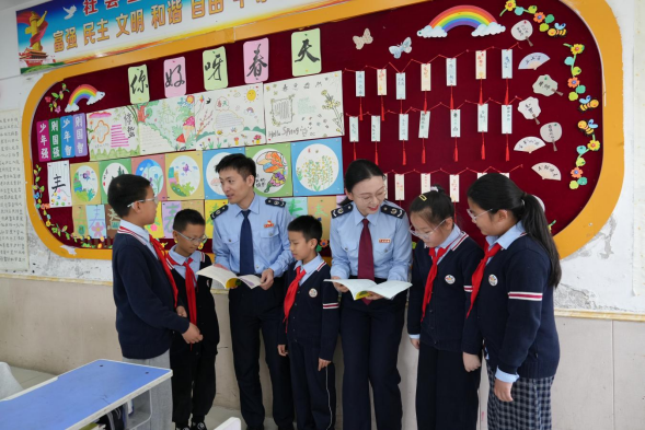 文化墙旁,税务干部与学生围坐共读税法读本,用亲切的讲解、温暖的陪伴,解答孩子们的疑问,让法治理念在少年心中悄然生根。