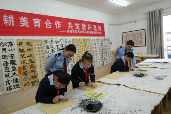在书法教室里,税务干部们陪伴学生挥毫泼墨,在“耕美育合作共筑教研高地”的浓厚氛围中,将法治文化与传统美育相结合,让孩子们在书写中感受文化魅力、树立法治观念。