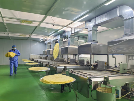腊月的寒风裹着愈发醇厚的年味儿钻进山东肥城汶阳镇贾南村,孝门食坊食品有限公司的生产车间里却热气腾腾。14台全自动煎饼机轰鸣运转,金黄的米浆在鏊子上均匀铺开,瞬间腾起阵阵白雾。