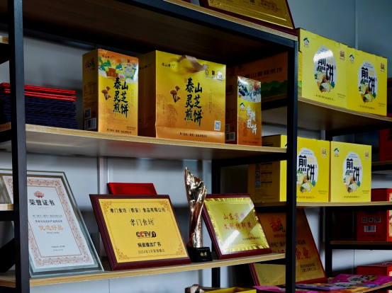 在分拣车间,机器传送带不停运转,将煎饼源源不断送往分拣区。贾培宝拿起一张黄精煎饼介绍:“这可是咱的‘金名片’,荣获过全国煎饼大赛特别奖、‘齐鲁粮油’暨省级‘好粮油’产品称号。”他指尖划过包装上的认证标识,语气里满是自豪。