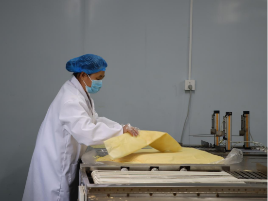 车间里的机器不停转,乡亲们的好日子也越过越红火。在包装车间,工人张曰梅将叠好的煎饼塞进包装袋里。“在家门口上班,一个月能拿3000多,顾家挣钱两不误,年底还有分红,咱这煎饼摊出的不仅是香味,更是好日子。”她眼角的笑纹里藏着满足,面前的包装台已经堆起半人高的成品。