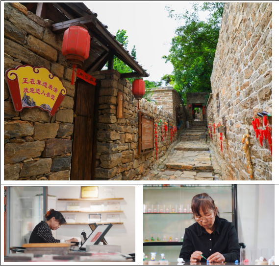 岁月流转中,五埠岭并未被时光尘封。近年来,这座古村以“非遗+文旅”的融合路径,让沉睡的文化资源焕发新生。2019年起,五埠岭伙大门景区对村内闲置民居进行保护性修缮,依托泰安市级非遗“青石干茬缝砌墙技艺”,打造了泰安市首个集保护、体验、研学于一体的非遗工坊示范基地,成功入选“全国非遗与旅游融合发展优选项目”。如今走进景区,桃木雕刻的匠心、岱宗传拓的雅致、许氏面塑的灵动、李君剪纸的精巧随处可见,10余项省市级非遗项目在此汇聚,形成了“看非遗、玩非遗、买非遗”的沉浸式体验空间。