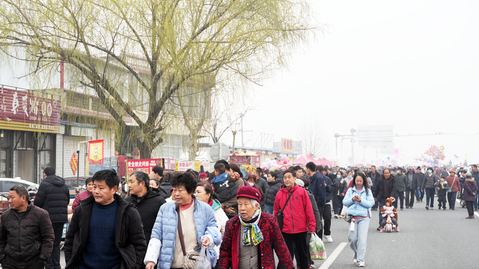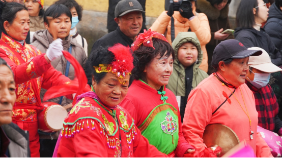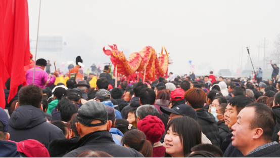 上午10点,在前旧县村村委大院门前,村民们组织的演出队伍,伴随着冲天的鞭炮齐鸣,浩浩荡荡地沿着村道向着旧县大桥游行。期间高跷、秧歌、锣鼓、舞龙等传统节目轮番上阵,香气四溢的小吃摊、贩卖工艺品的商贩在道路两侧一直延伸至桥面,它们与村民一同,构成一幅专属于旧县的民俗画卷。