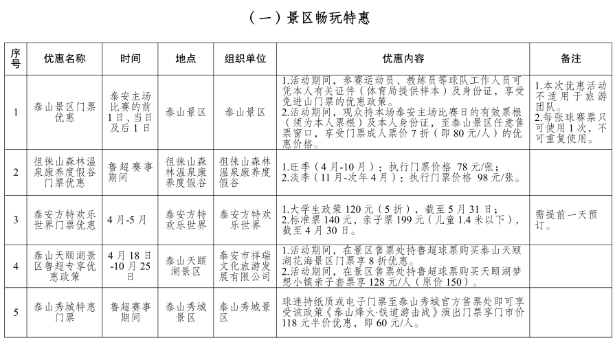2.活动期间,观众持本场泰安主场比赛日的有效票根(须为本人票根)及本人身份证,至泰山景区任意售票窗口,享受门票成人票价7折(即80元/人)的优惠价格。