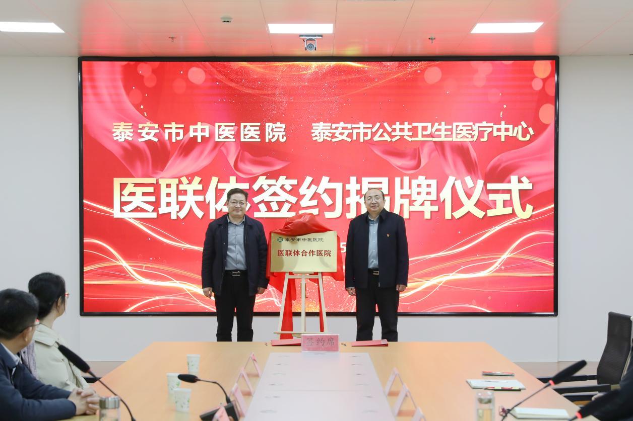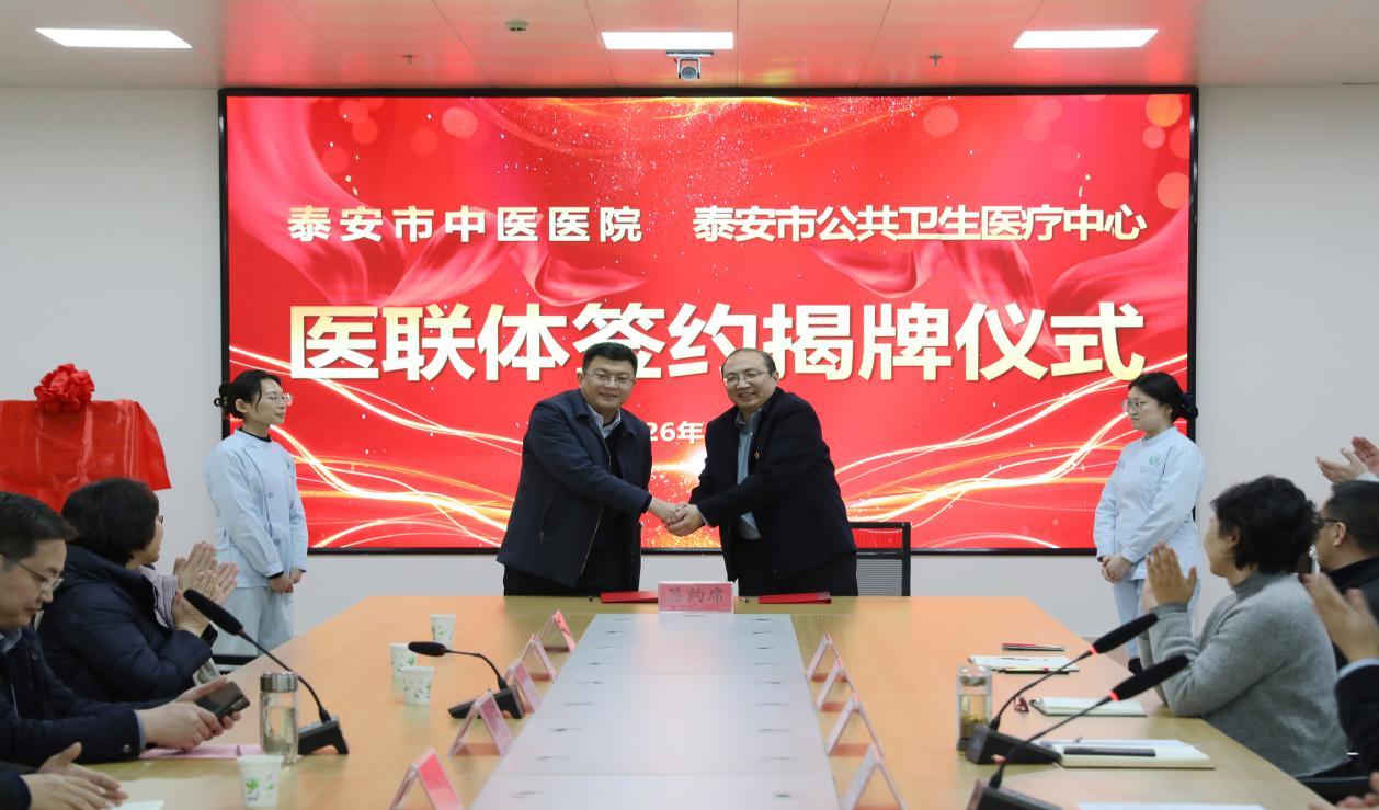 近日,泰安市中医医院与市公共卫生医疗中心医联体签约暨揭牌仪式在市公共卫生医疗中心举行。此次合作正式确立两家医院的医联体关系,标志着双方将在资源共享、优势互补、中西医协同等方面迈出关键步伐,为泰安市民提供更优质、高效、连续的整合型医疗健康服务。
