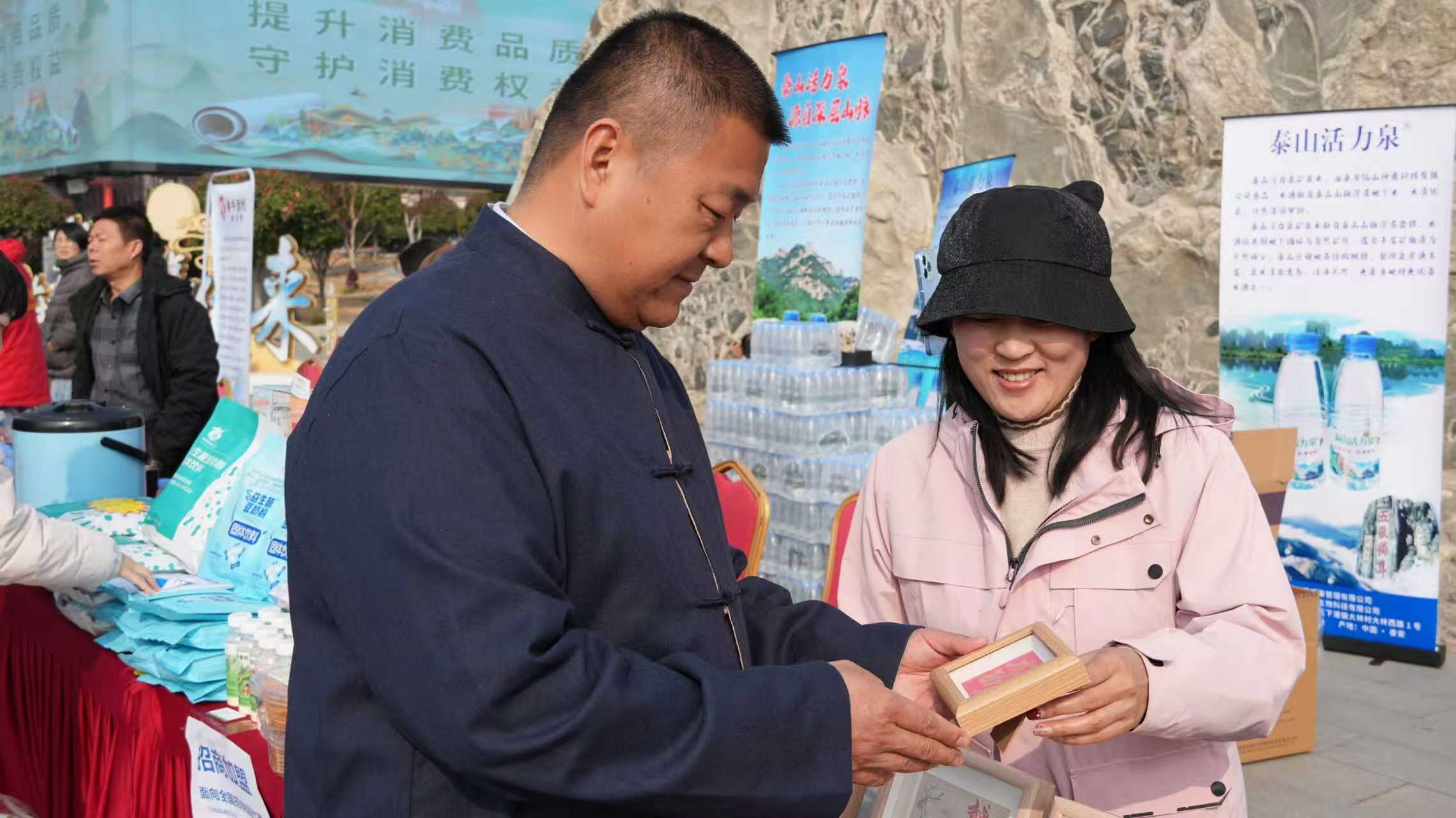 活动同步启动“3·15消费大集”,泰山立体拓印、糖画、葫芦雕刻等非遗互动项目及泰安城市吉祥物“敢敢、当当”等文创展销吸引众多市民游客,展现泰山文化魅力,激发了消费市场活力。
