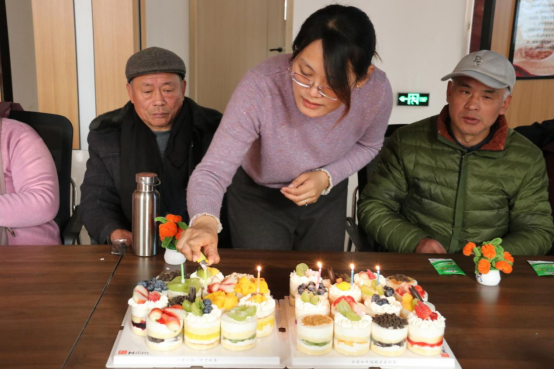随着热气腾腾的饺子出锅,活动进入温馨高潮—集体庆生环节。“祝你生日快乐,祝你生日快乐,祝你生日快乐,祝你生日快乐。”生日蜡烛缓缓点亮,熟悉的歌声响起,“寿星”们在众人祝福中许愿、吹烛,掌声与欢呼不断。老人们围坐一堂,共享鲜美的冬至水饺与甜蜜的生日蛋糕,闲话家常,真情流淌。活动尾声,每位老人带着寓意美好的“柿柿如意”盆栽和满心温暖踏上归途。这场简单而真挚的冬日聚会,用陪伴与欢笑,为老人们留下了无比治愈的美好回忆。