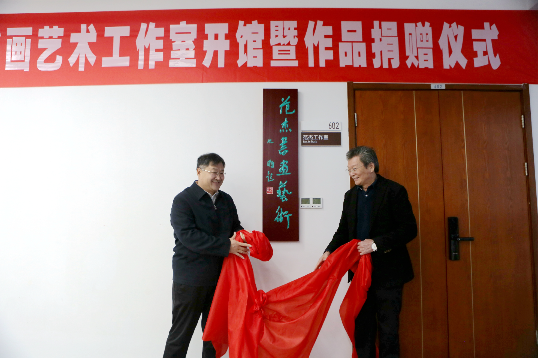在热烈的掌声中,满军与范杰共同为“范杰书画艺术工作室”揭牌。