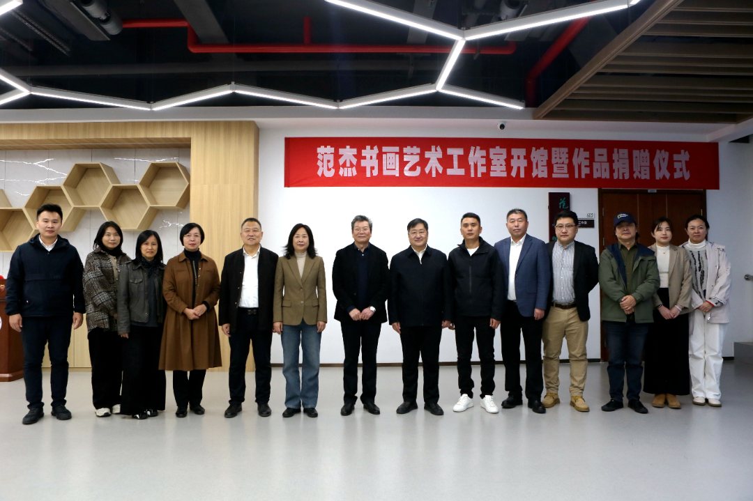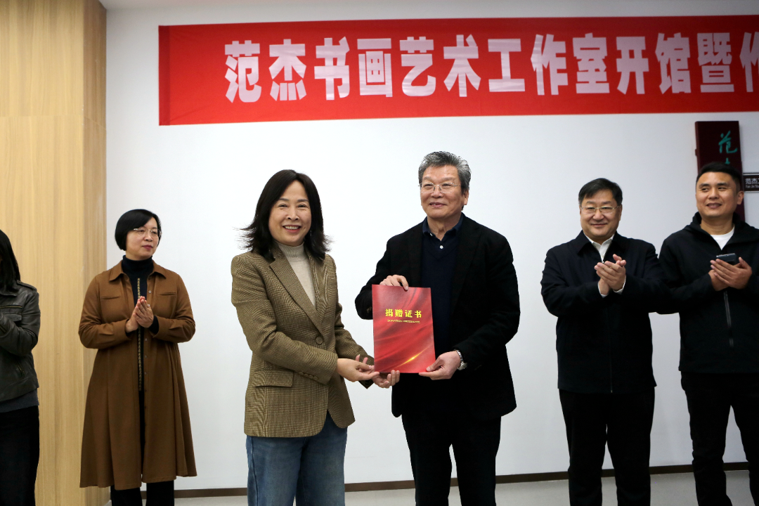 11月12日,范杰书画艺术工作室开馆暨中国画作品捐赠仪式在淄博师专图书馆举行。山东省美术家协会副主席、淄博市文联副主席、淄博市美术家协会主席范杰,学校党委书记满军,党委副书记、校长高霞出席活动。