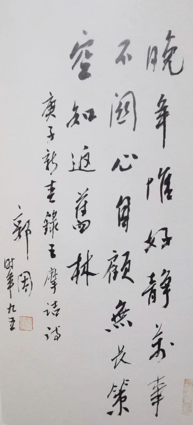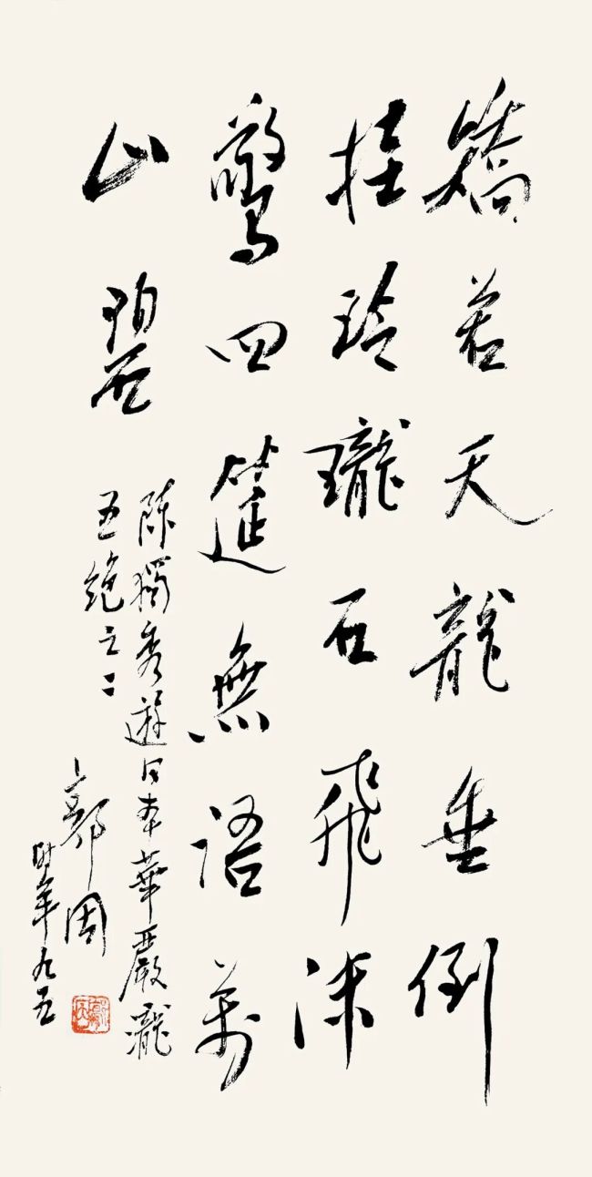 造访结束时,郭老特意将近作《曾公亮•宿甘露寺》诗轴赠送于我。他愿以“要看银山拍天浪,开窗放入大江来”的诗境,从千峰万壑转向长江巨浪,鼓励着我们这一代人勤奋学习、广采博览,开启一个奇丽广阔的美学新境界。