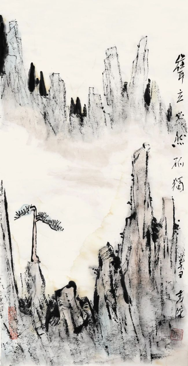 山川与神遇而迹化,魂魄化灵动而入微。在郭老的山水世界里,隐然有一种属于心灵上触引感发的力量,不时洋溢着打破陈规的活脱气象与勃勃生机,这其中奥意不仅蕴含着深邃静穆的人文智思,又折摄出超越时空的禅悦之境。正如他在《我说我》的文中所感慨的“我从绿色的原点走来,我向绿色的未来走去;我饱经风雨,但我从不停步;无论生死,我都与天地万物为一体”。这种情怀与担当,正是他“传递绿色美学理念,引领和谐社会新风尚”的心灵写照。他呼唤自然之美,倡导绿水青山与人文情怀的合谐共生。立身于他的山水丘壑之间,沉浸于他的人文笔墨世界,无不透射出人与自然的合谐共鸣与对壮美山河的高声礼赞。正如郭老录郭沫若先生诗中所言:有笔在手,有话在口。以手写口,龙蛇乱走。心无汉唐,目无钟王。老当益壮,兴到如狂。这或许就是郭因老《大美之巅——郭因作品集》印行的初衷吧!