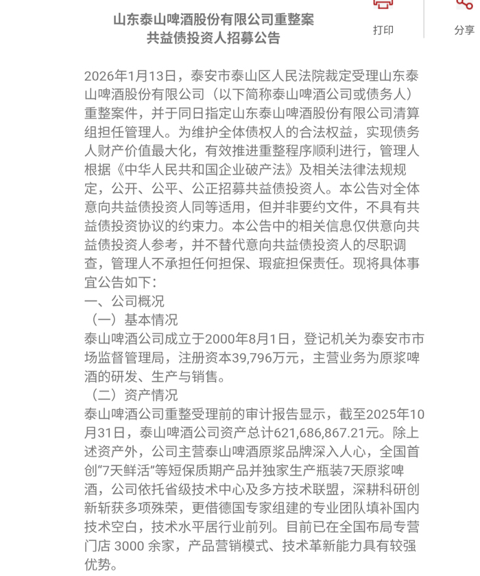 此前的2026年1月13日,泰安市泰山区人民法院裁定受理泰山啤酒破产重整申请,指定清算组担任管理人。经审计,截至2025年10月31日,泰山啤酒资产总计约6.22亿元,负债总额约6.63亿元,资产负债率106.63%,已资不抵债且明显缺乏清偿能力,法院依法受理了其破产重整申请。