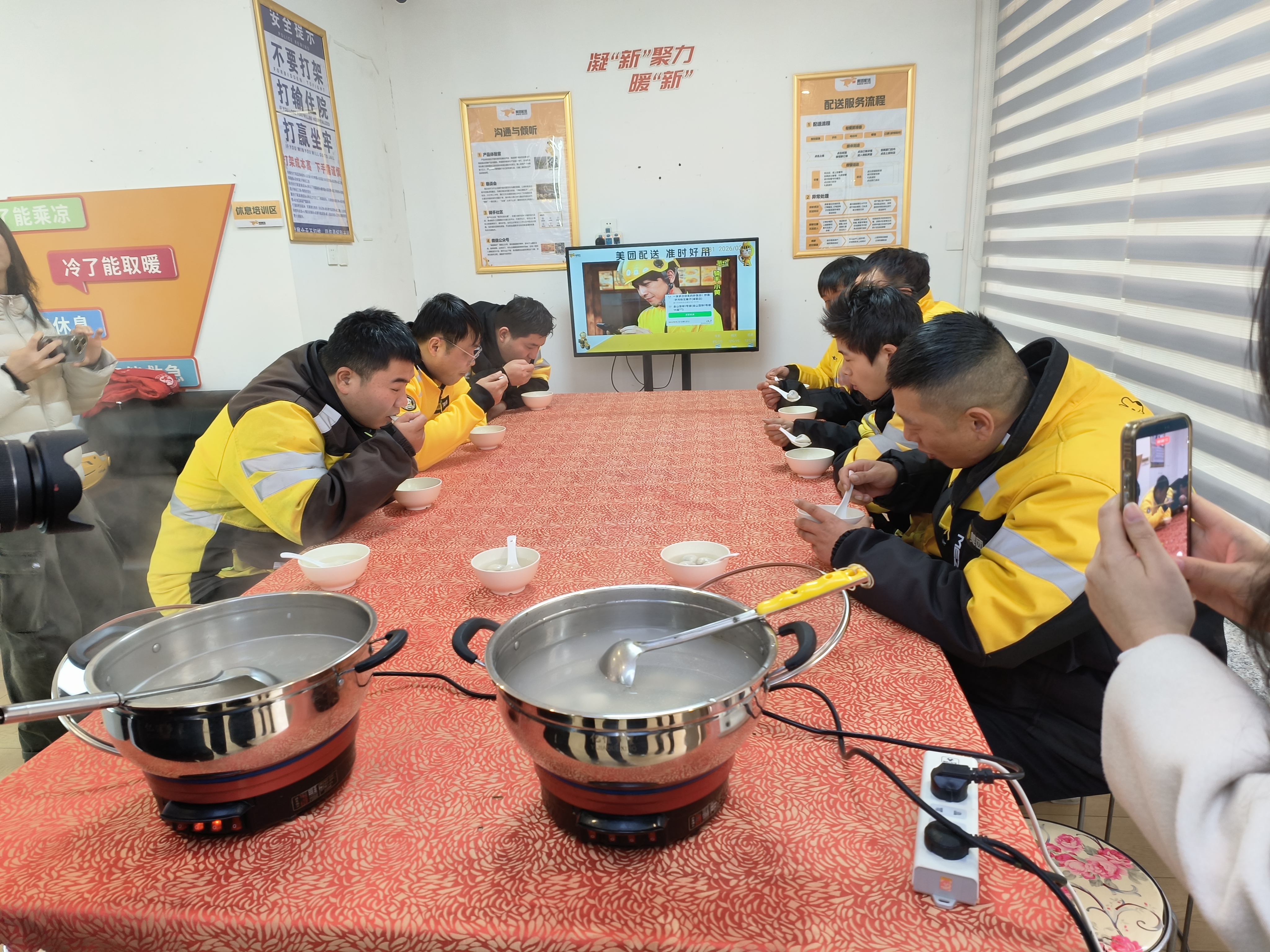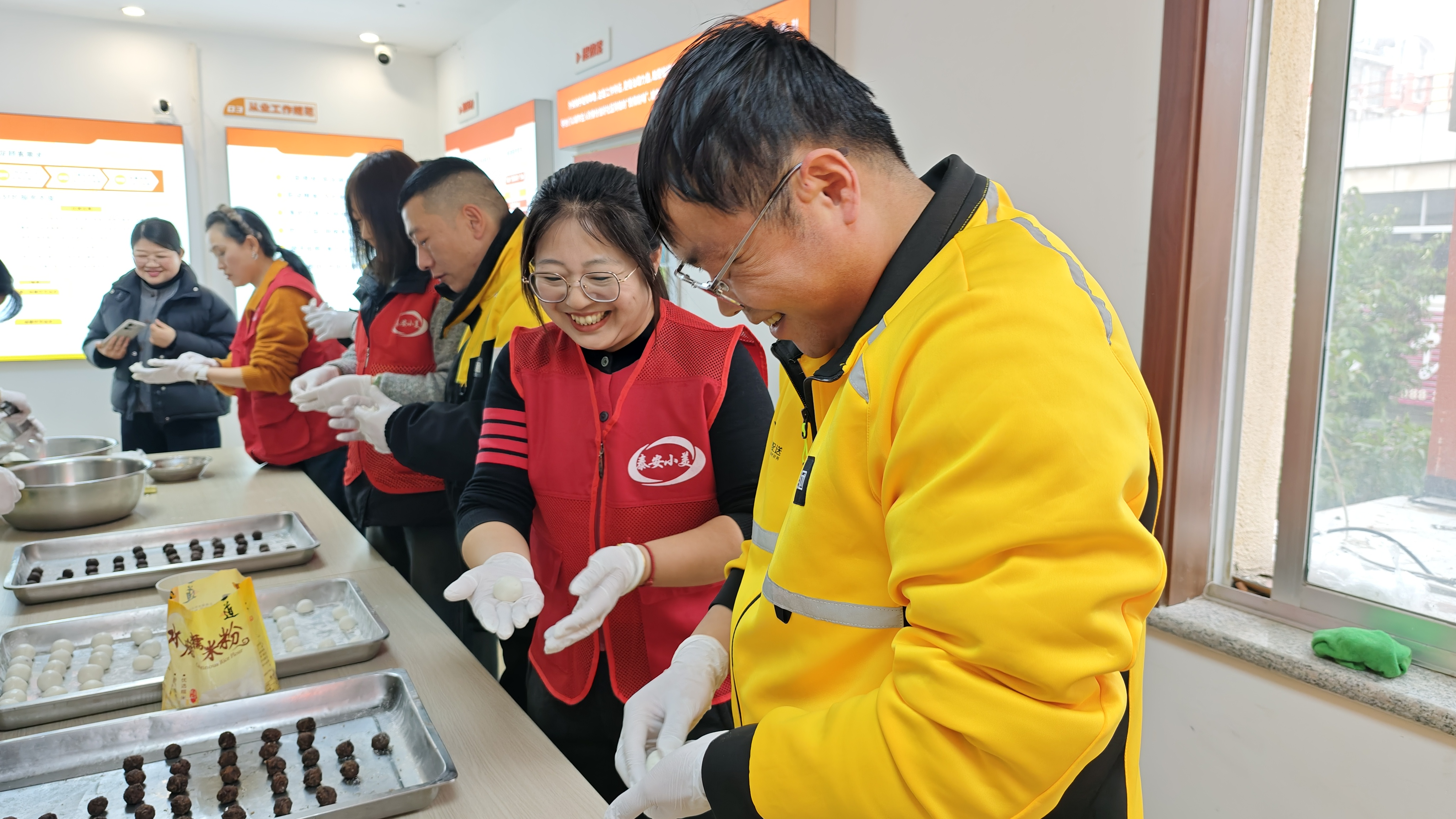 活动现场,糯米粉、豆沙馅等食材整齐摆放,社区工作人员、志愿者与外卖小哥们围坐一起,揉面、包馅、搓圆,分工有序,配合默契。在欢声笑语中,一颗颗圆润饱满的汤圆逐渐摆满托盘,现场洋溢着温馨和谐的节日气息。随着汤圆下锅煮熟,驿站内香气四溢,大家围坐品尝热气腾腾的汤圆,暂时卸下奔波的疲惫,感受“家”的温暖。